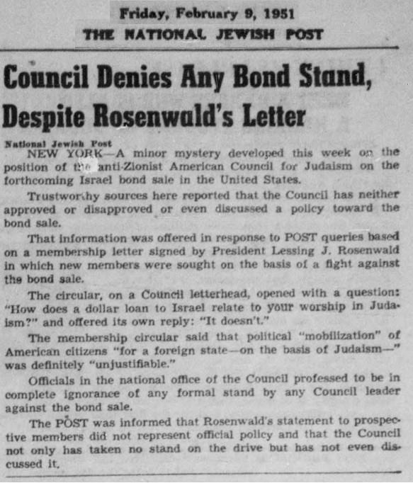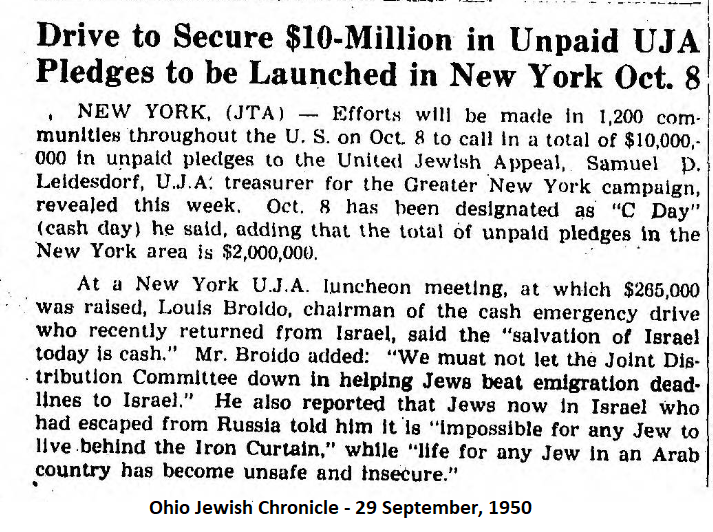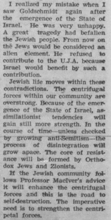 Apparently, the Gentile professor took issue with the AJC’s contention that “the American Jew can lead a full Jewish life as an integrated American”. Why can’t one be Jewish and an integrated American at the same time? Because if you go by what the Jewish publications were writing about in the early 50s, being Jewish meant raising funds for Israel, decrying the poor treatment Israel was receiving on the international stage and from its blood-thirsty neighbors, raising funds for Israel, creating youth movements centered around the centrality of Israel in the life of American Jews, fund raising, complaining about antisemitism and celebrating the enormous power of the Jewish community to sideline those who were critical of them or of Israel or of their relationship to Israel (aka anti-Semites). Hard to imagine it today, but that’s how things were like, back in the 1950s.