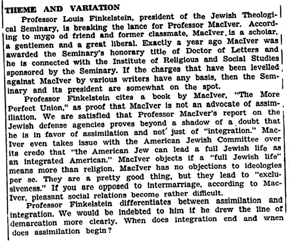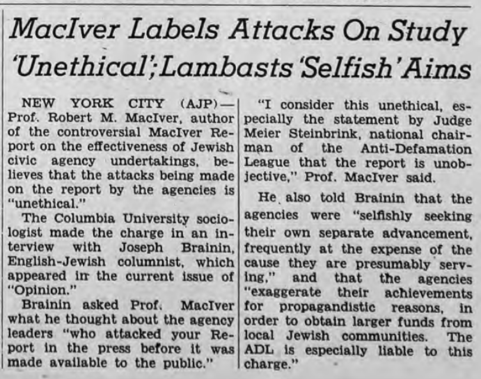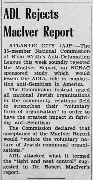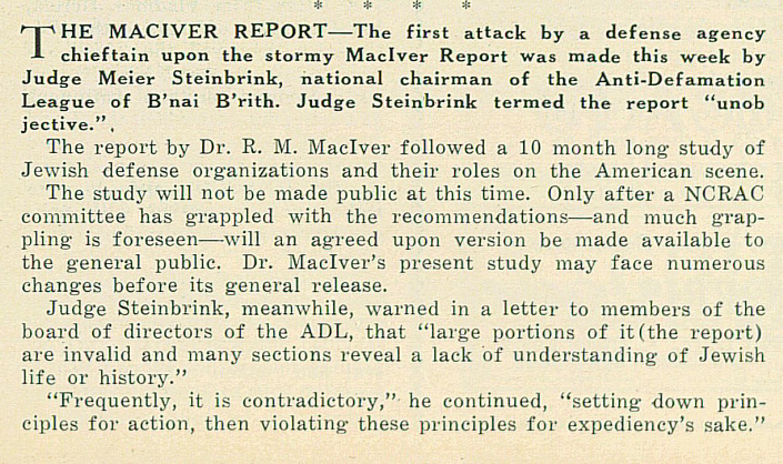 Robert MacIver, Scottish-born sociologist from Columbia university, who worked alongside members of the Frankfurt school when they were associated with that institution, was commissioned to conduct a study of the work of “Jewish defense” organizations, on behalf of the National Community Relations Advisory Council, between 1950 and ’51 (Jewish defense = “growing anti-Semitism”, in order to “strengthen the centripetal forces”).
